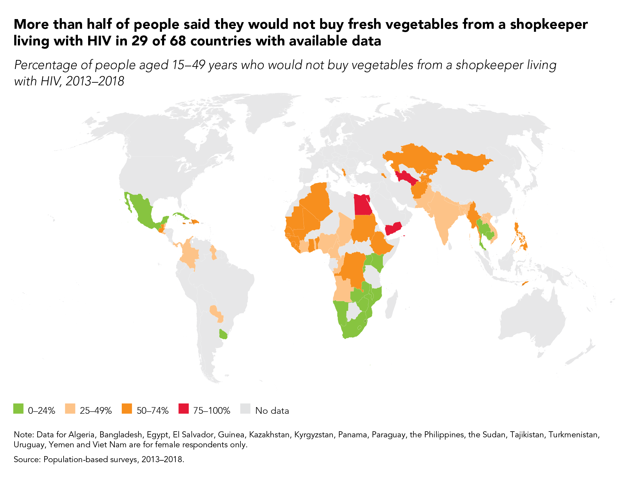 В 29 из 68 стран с доступными данными по одному из двух вопросов в рамках комплексного показателя за период 2013–2018 гг. более половины людей в возрасте 15–49 лет ответили, что не будут покупать свежие овощи у продавца, живущего с ВИЧ. В трех из этих стран такой ответ дали более 75 % опрошенных.