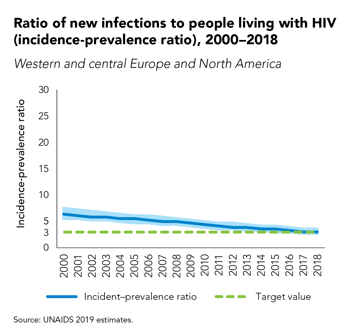 В странах Западной и Центральной Европы и Северной Америки, в которых в целом широкий охват медицинскими услугами и комплекс методов профилактики ВИЧ доступен большому проценту людей с высоким риском заражения ВИЧ, соотношение между уровнем заболеваемости и уровнем распространенности в 2018 году составляло 3,1 %. Показатели в других регионах разнятся: 3,9 % в Восточной и Южной Африке; 4,6 % в Карибском регионе; 5,4 % в Латинской Америке, Азии и Азиатско-Тихоокеанском регионе; 5,5 % в Западной и Центральной Африке; 8,0 % на Ближнем Востоке и в Северной Африке; 9,0 % в Восточной Европе и Центральной Азии.